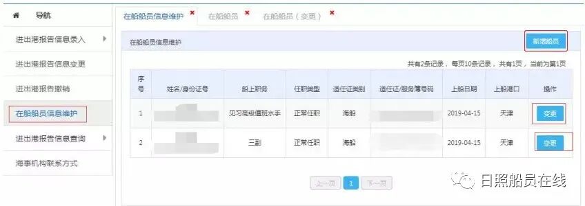 答:方式一:在办理船舶进出港报告时,登录中国海事综合服务平台—船舶管理—船舶报告系统,点击左侧导航栏中的“在船船员信息维护”,显示本船现有在船船员信息。